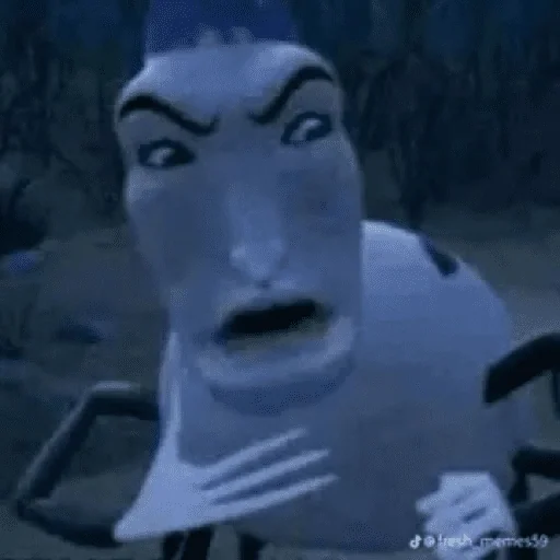 Personagem de desenho animado com expressão de surpresa ou medo, com olhos arregalados e boca aberta. Ele tem uma aparência azulada e parece estar usando um chapéu.