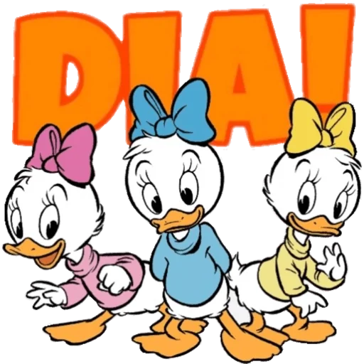Três patinhas femininas de desenho animado com laços coloridos e a palavra 'DIA!' em letras grandes ao fundo.