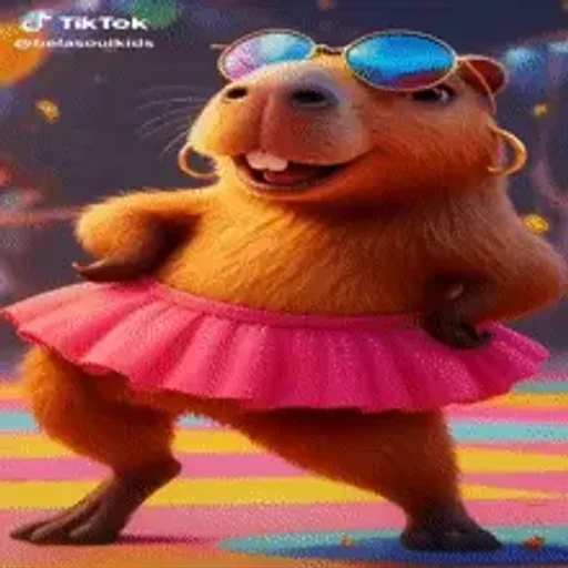 Um capivara usando óculos de sol coloridos e um tutu rosa, com expressão alegre e divertida. Ao fundo, há luzes coloridas e o logotipo do TikTok.