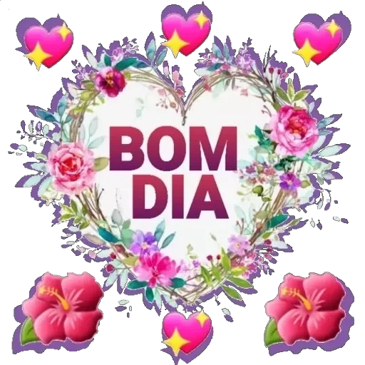 Um coração floral com a frase 'BOM DIA' no centro, rodeado de flores cor-de-rosa e roxa e corações decorados.