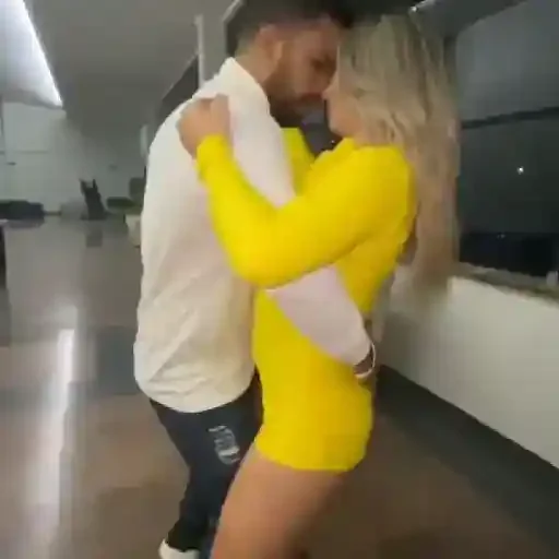 Um casal se beijando, o homem de camisa branca e calça preta, a mulher de vestido amarelo e cabelo loiro.