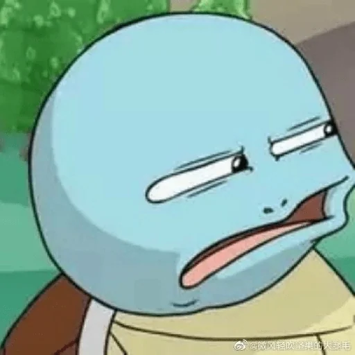 Um personagem de anime com cabeça grande e azul, parecendo confuso ou surpreso, com olhos estreitos e boca aberta.