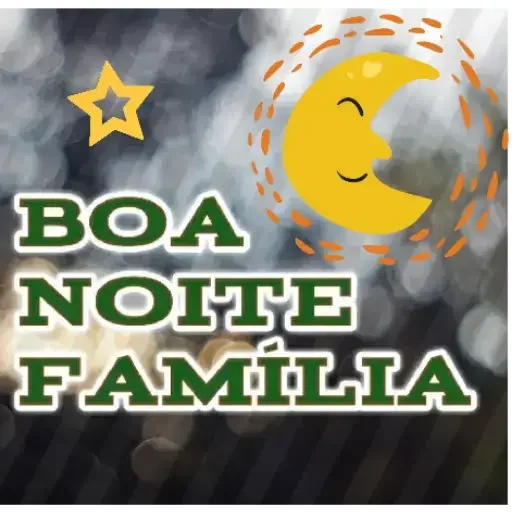 Uma lua amarela sorrindo com uma estrela amarela ao lado, com o texto 'BOA NOITE FAMÍLIA' em verde.