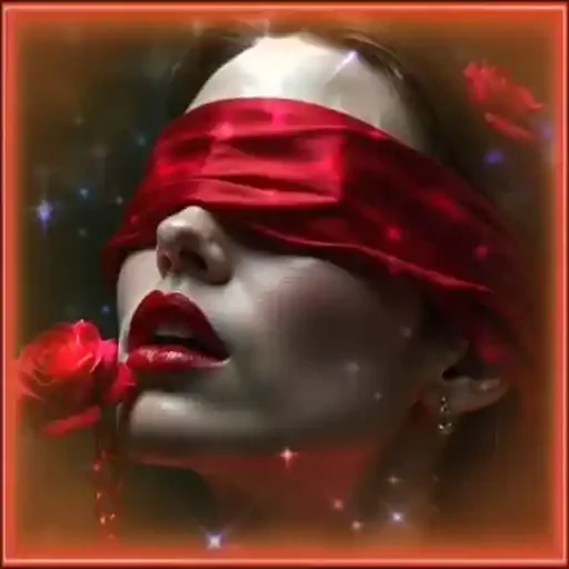 Rosto de mulher com os olhos cobertos por uma faixa vermelha, beijando uma rosa vermelha. A imagem tem um efeito brilhante e um quadro vermelho.