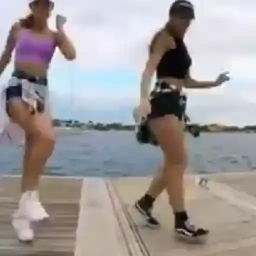Duas mulheres dançando em um cais, uma usando roupa rosa e a outra de preto, com o mar ao fundo.