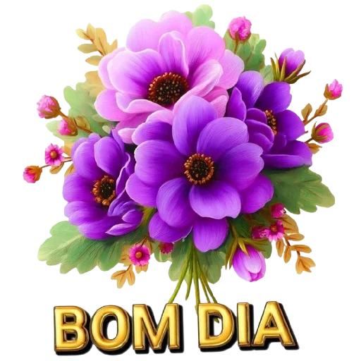 Um buquê de flores roxas e lilases com folhas verdes e pequenos botões rosa, com o texto 'BOM DIA' em letras douradas.