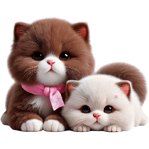 Dois gatinhos fofos, um marrom com uma faixa rosa no pescoço e outro branco, ambos com olhos grandes e expressões adoráveis.