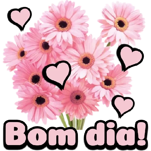 Um buquê de flores rosa com corações rosa e a frase 'Bom dia!' em letras rosa.