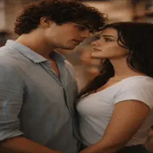 Um casal se olhando, com o homem de camisa cinza e a mulher de vestido branco, ambos com expressões românticas.
