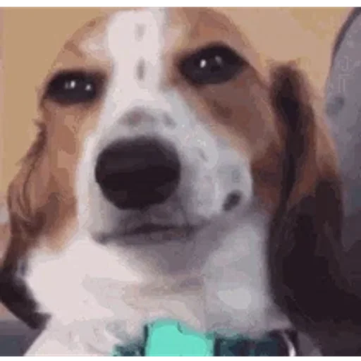Um cachorro com focinho preto e olhos castanhos, pelagem marrom e branca, e uma coleira verde.