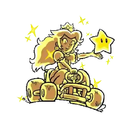 Princesa Peach dourada sentada em um kart, segurando uma estrela com um sorriso no rosto, cercada de estrelas douradas.