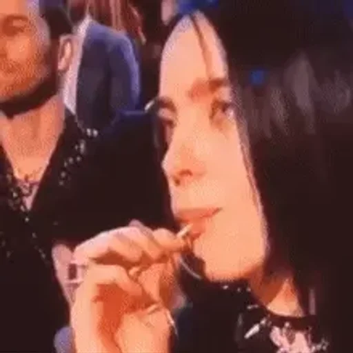 Mulher com cabelos pretos e unhas decoradas com anéis, segurando um objeto aceso perto da boca.