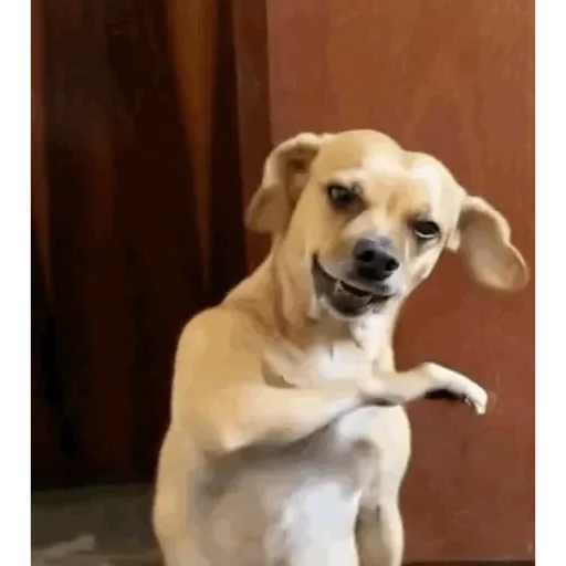 Cachorro deitado em duas pernas com a pata dianteira levantada e expressão facial cômica.