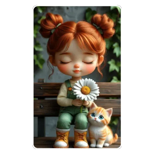Menina com coque duplo e olhos fechados sentada em um banco com um gato laranja ao lado, segurando uma margarida branca.