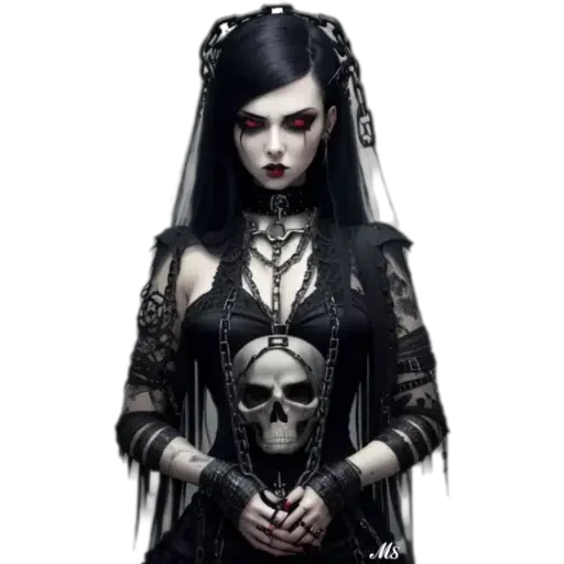 Uma mulher com olhos vermelhos e maquiagem escura, usando um chapéu preto com uma caveira branca, um crucifixo e um…