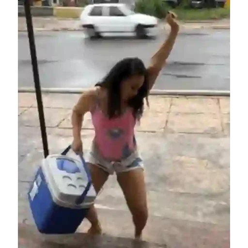 Uma mulher dançando na chuva com uma caixa de isopor azul e branca na mão, usando uma camiseta rosa e shorts jeans.