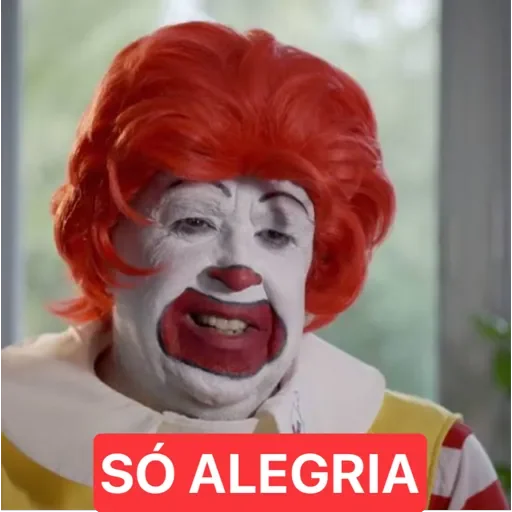 Ronald McDonald com uma expressão de alegria, usando uma peruca vermelha e maquiagem branca com um sorriso largo e vermelho. O texto 'SÓ ALEGRIA' aparece em um retângulo vermelho abaixo dele.