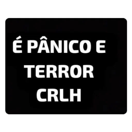Um retângulo preto com texto branco em português que diz 'É PÂNICO E TERROR CRLH'.