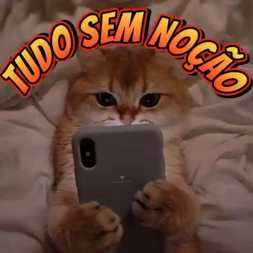 Gato laranja com expressão séria olhando para um celular, com as palavras 'TUDO SEM NOÇÃO' em arco acima dele.