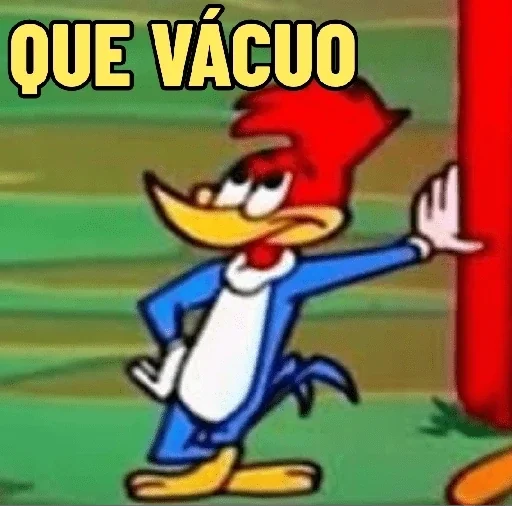 Um pica-pau de desenho animado com penas azuis, bico amarelo e crista vermelha, com a frase 'QUE VÁCUO' em letras amarelas acima dele.