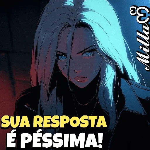 Uma personagem de anime com cabelos longos e claros e olhos azuis, com expressão séria. Ela está vestida de preto e o fundo é escuro. Abaixo dela, está escrito 'SUA RESPOSTA É PÉSSIMA!'