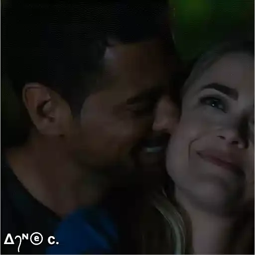 Um casal se beijando ao luar, com o homem beijando a bochecha da mulher. O texto 'ΔΎΟ c.' aparece no canto inferior esquerdo.