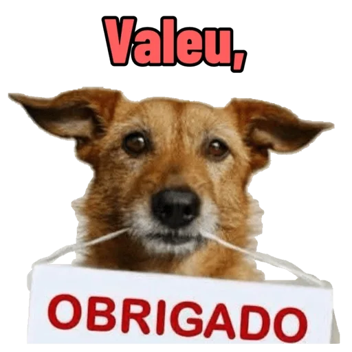 Um cachorro com orelhas levantadas e expressão neutra segura um papel com a palavra 'OBRIGADO' na boca. Acima do cachorro, está escrito 'Valeu,' em letras vermelhas.