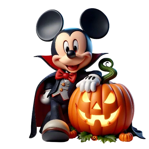 Mickey Mouse vestido de vampiro ao lado de uma abóbora de Halloween com uma expressão feliz.