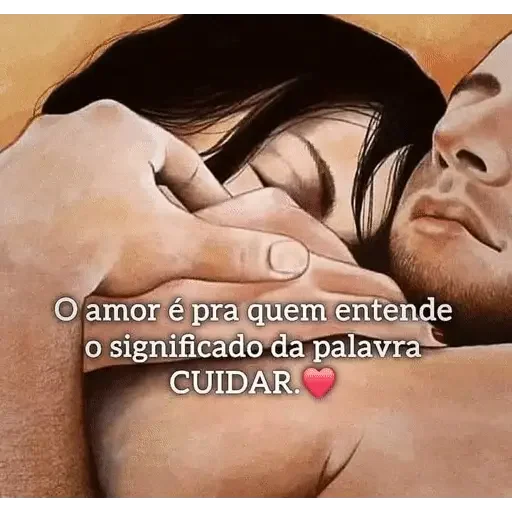 Um casal abraçado, com a mão do homem acariciando o cabelo da mulher. A imagem contém o texto 'O amor é pra quem entende o significado da palavra CUIDAR' com um coração vermelho.