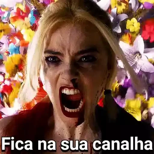 Uma mulher loira com expressão de raiva, boca aberta e dentes arreganhados, em frente a um fundo de flores coloridas. O texto 'Fica na sua canalha' aparece na parte inferior.