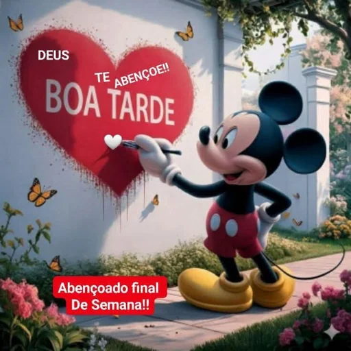 Mickey Mouse pinta um coração vermelho com a frase 'DEUS TE ABENÇOE BOA TARDE' enquanto borboletas voam ao redor. Ele está em um jardim com flores e um texto em uma faixa vermelha lê 'Abençoado final de Semana!!'