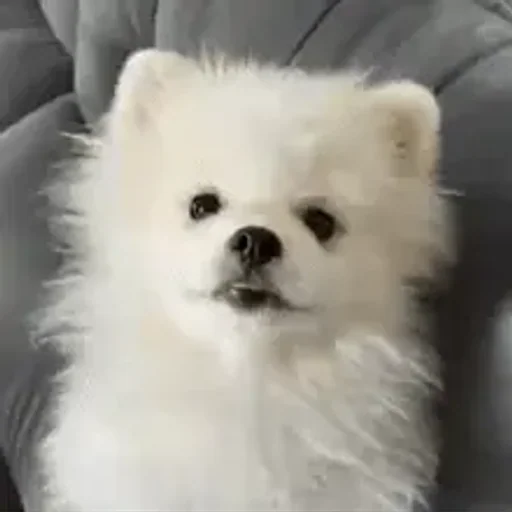 Cachorro branco fofo com pelo longo, sentado em um sofá cinza, olhando para frente com expressão curiosa.