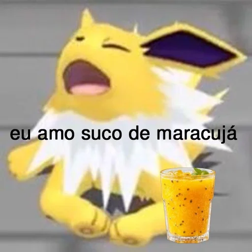 Um Pikachu com expressão de felicidade e um copo de suco de maracujá, com o texto "eu amo suco de maracujá" sobreposto.