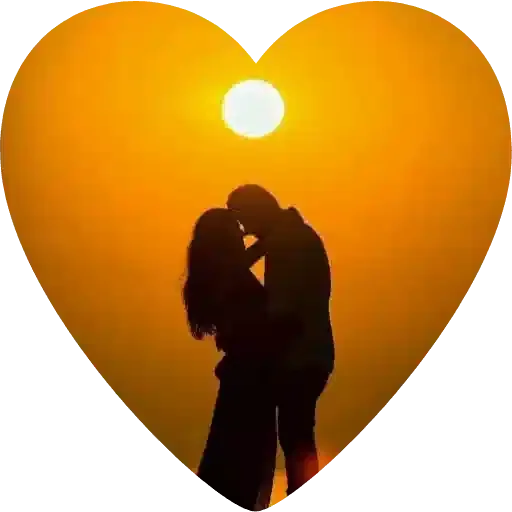 Um casal se beijando em silueta contra um pôr do sol, dentro de um coração laranja.