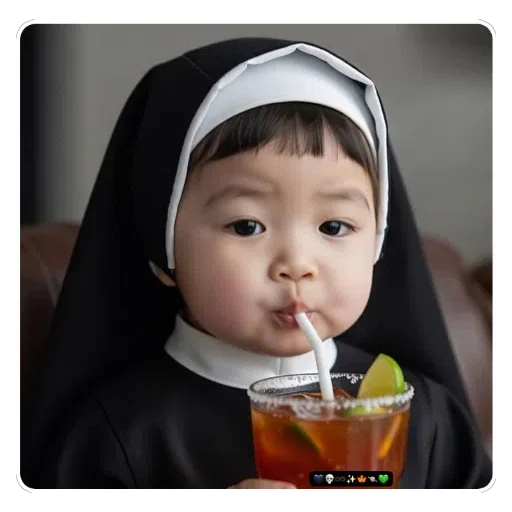 Uma criança vestida de freira bebendo um suco laranja com um canudo, com uma fatia de limão no copo.