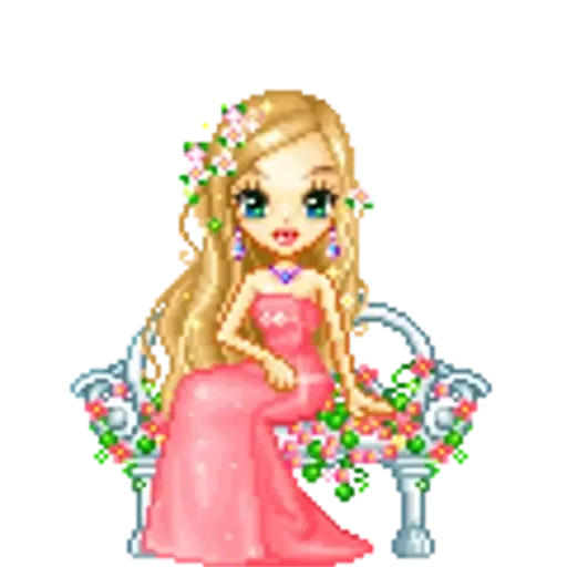 Uma menina de cabelos loiros longos e olhos azuis brilhantes sentada em um banco decorado com flores, vestindo um vestido rosa e uma coroa de flores no cabelo.