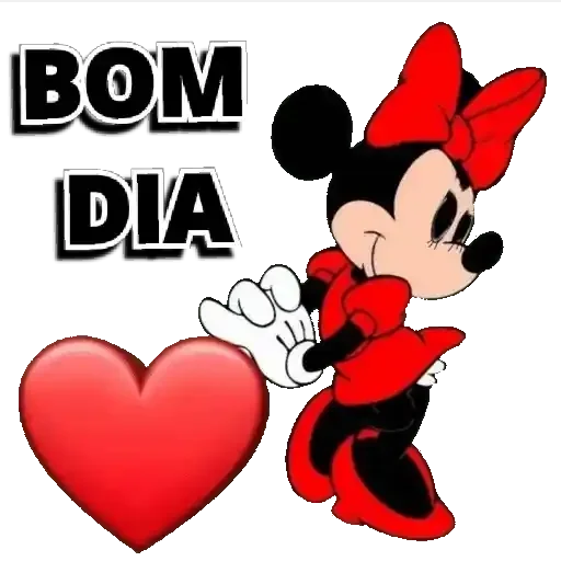 Minnnie Mouse vestida de vermelho, com um laço vermelho no cabelo e um coração vermelho, ao lado do texto 'BOM DIA'.