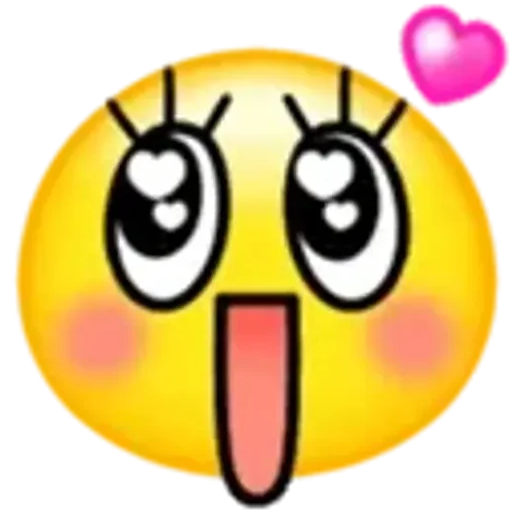 Rosto de emoji amarelo com olhos grandes e coração, língua para fora e corações nas bochechas, com um coração rosa no canto superior direito.