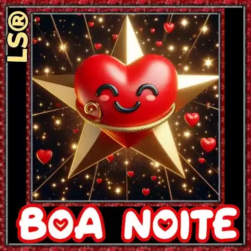 Um coração vermelho sorridente com olhos fechados em uma estrela dourada, rodeado de corações e luzes. Abaixo, 'BOA NOITE' em letras brancas.