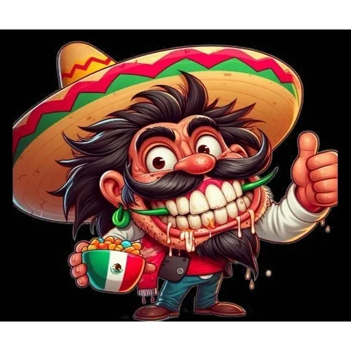 Um personagem cartoon com bigode e sombrero mexicano, com um jarro de cerveja na mão e um polegar para cima, parecendo feliz e animado.