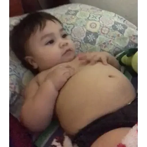 Um bebê deitado de costas com as mãos no peito, barriga grande e cabelos pretos.