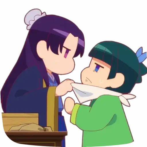 Uma garota com cabelo roxo e um menino com cabelo preto e verde, ambos com expressões sérias, estão envolvidos em uma ação de alimentar o menino com uma colher.