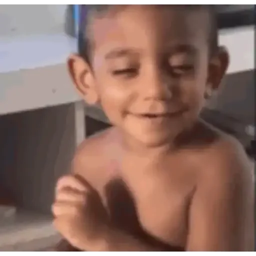 Menino sorrindo com os olhos fechados, sem camisa, com a mão levantada.