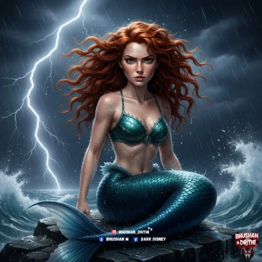 Sereia ruiva com cabelos ondulados sentada em rochas à beira-mar, usando uma concha verde como sutiã, com raio branco ao fundo e ondas agitadas.