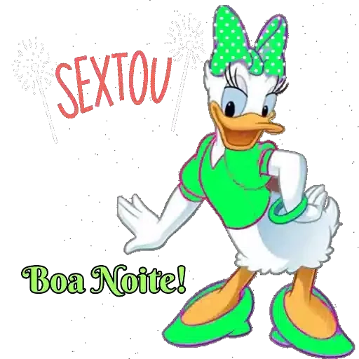 Dona Pata, personagem de desenho animado, vestida com um look feminino, usando um vestido branco e uma blusa verde, sapatos verdes e um laço verde na cabeça. Ela está com a frase 'SEXTOU' em vermelho acima e 'Boa Noite!' em verde abaixo.