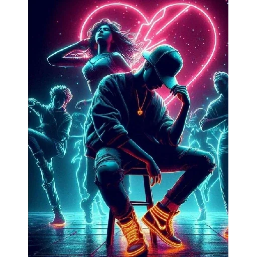 Um homem sentado em uma cadeira, pensativo, com uma mulher dançando ao fundo e um coração de neon rosa. Ele usa uma corrente e tênis laranja.