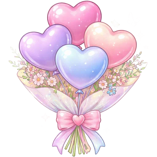 Um buquê de balões em forma de coração em tons de rosa, roxo e azul, com flores e um laço rosa.