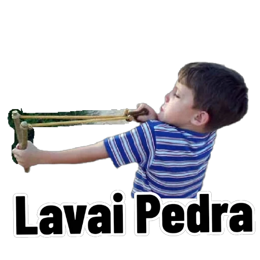 Menino de camisa listrada azul e branca apontando uma catapulta com as mãos, com o texto 'Lavai Pedra' embaixo.