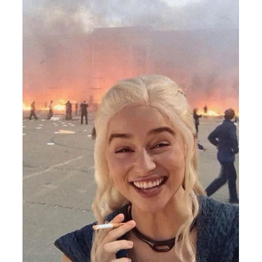 Uma mulher loira sorri enquanto segura um cigarro, com uma paisagem de incêndio ao fundo. Ela veste uma roupa escura e tem uma expressão alegre.