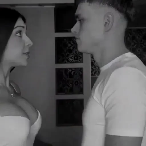 Um casal se olhando em preto e branco, com o homem usando uma camiseta branca e a mulher um vestido branco, em um ambiente com uma janela ao fundo.